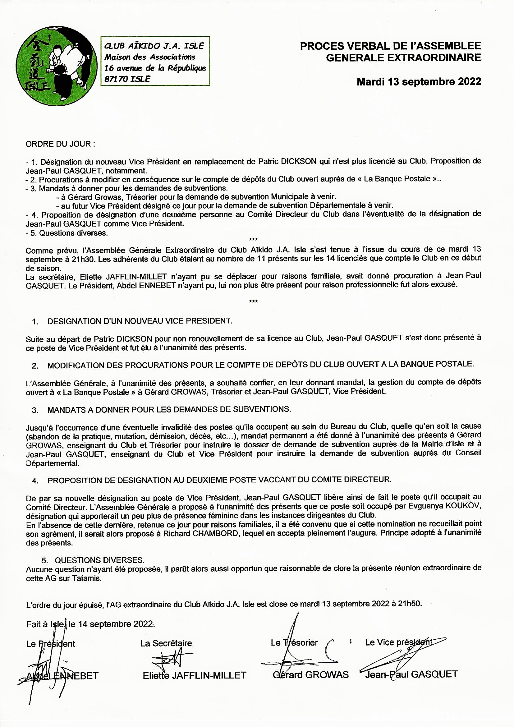 L'Assemblée Générale extraordinaire du Club s'est donc tenue le mardi 19 novembre 2024 à 21h45 à la suite du cours. 13 présents dont 1 porteur de 4 pouvoirs, soit 17 voix possibles sur 23 inscrits, le quorum avait donc belle assise pour permettre les votes. Etaient présent(e)s : Lily, Nicole, Christiane, Evguenya, Albert, Pierre-Alexandre, Faiz, Pascal, Laurent, Jacques L., Stephane, Christophe et gg porteur de 4 pouvoirs (Patrick, Abdel, Jean-Paul et Jacques G.) Les nouveaux Statuts du Club ont été adoptés à l'unanimité des présents, le Règlement Intérieur proposé et approuvé par le Comité Directeur et le Bureau a été ratifié, toujours à l'unanimité des présents et mandat a été donné de semblable façon à GG, Enseignant et Trésorier du Club pour déclarer officiellement ces modifications auprès de la Préfecture de la Haute-Vienne. Ce qui a été fait le jeudi 21 novembre 2024. |