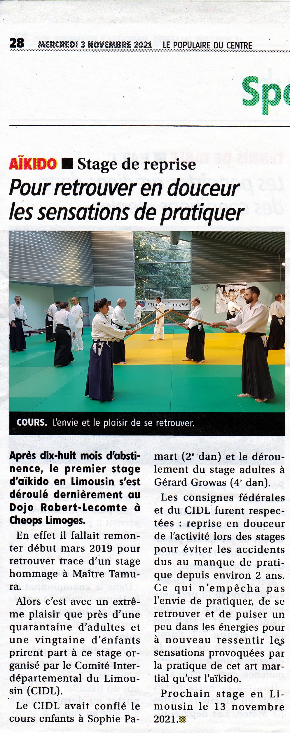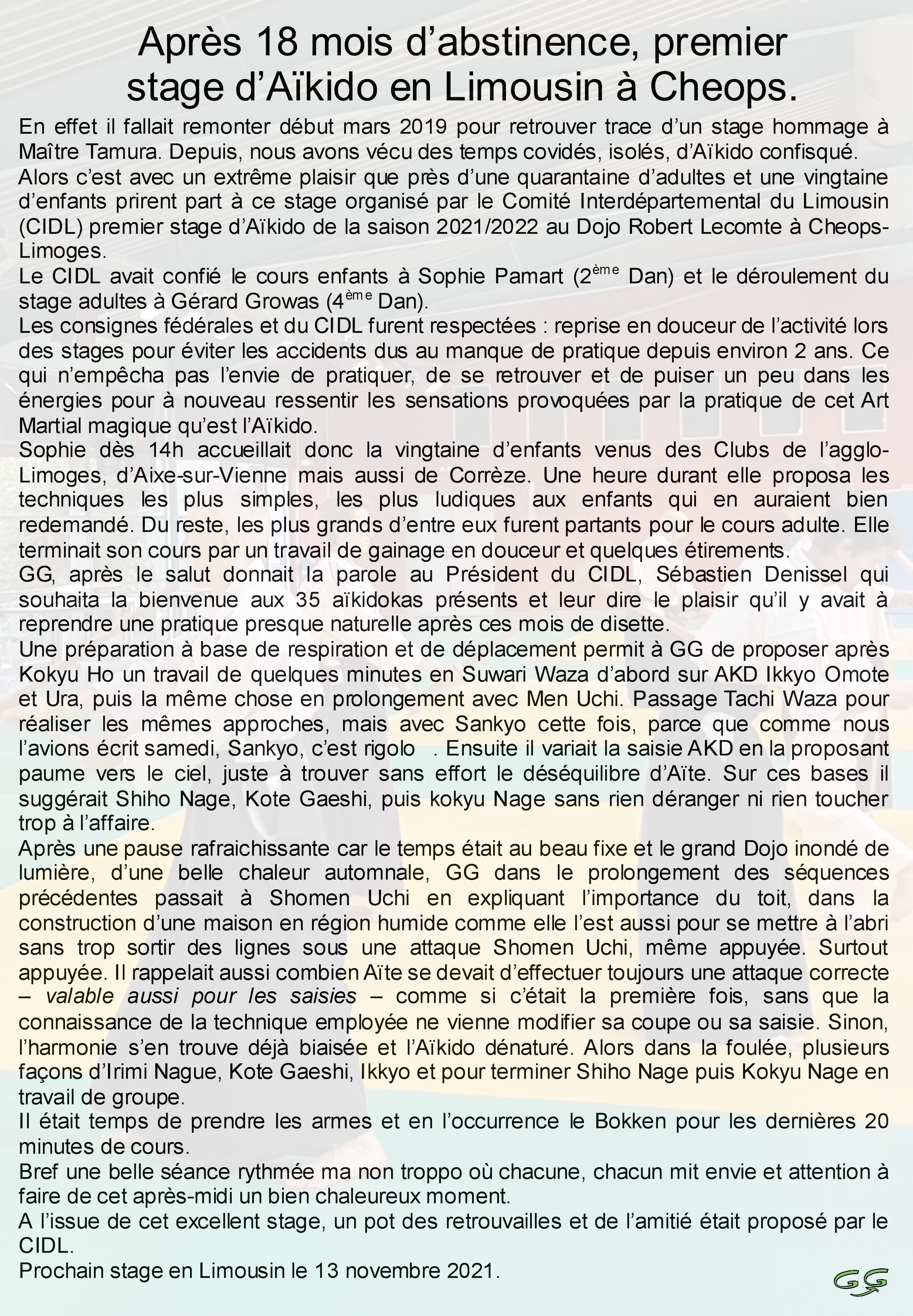 Après 18 mois d’abstinence..., en effet il fallait remonter début mars 2019 pour retrouver trace d’un stage hommage à Maître Tamura. Depuis, nous avons vécu des temps covidés, isolés, d’Aïkido confisqué. Alors c’est avec un extrême plaisir que près d’une quarantaine d’adultes et une vingtaine d’enfants prirent part à ce stage organisé par le Comité Interdépartemental du Limousin (CIDL) premier stage d’Aïkido de la saison 2021/2022 au Dojo Robert Lecomte à Cheops-Limoges. Le CIDL avait confié le cours enfants à Sophie Pamart (2ème Dan) et le déroulement du stage adultes à Gérard Growas (4ème Dan). Cliquer pour lire la suite. |