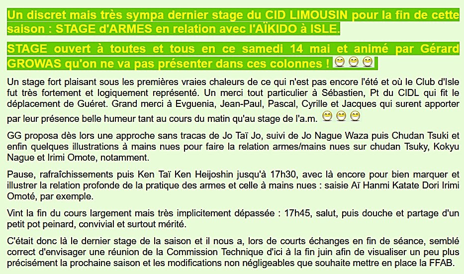 Un stage aussi plaisant que discret pour ce dernier de la saison 2021/2022, sous les premières vraies chaleurs de ce qui n'est pas encore l'été et où le Club d'Isle fut très fortement et logiquement représenté. Un merci tout particulier à Sébastien, Pt du CIDL qui fit le déplacement de Guéret. Grand merci à Evguenia, Jean-Paul, Pascal, Cyrille et Jacques qui surent apporter par leur présence belle humeur tant au cours du matin qu'au stage de l'a.m. Quelques photos et vidéo de Pascal Fouilloud et mise en images gg. |