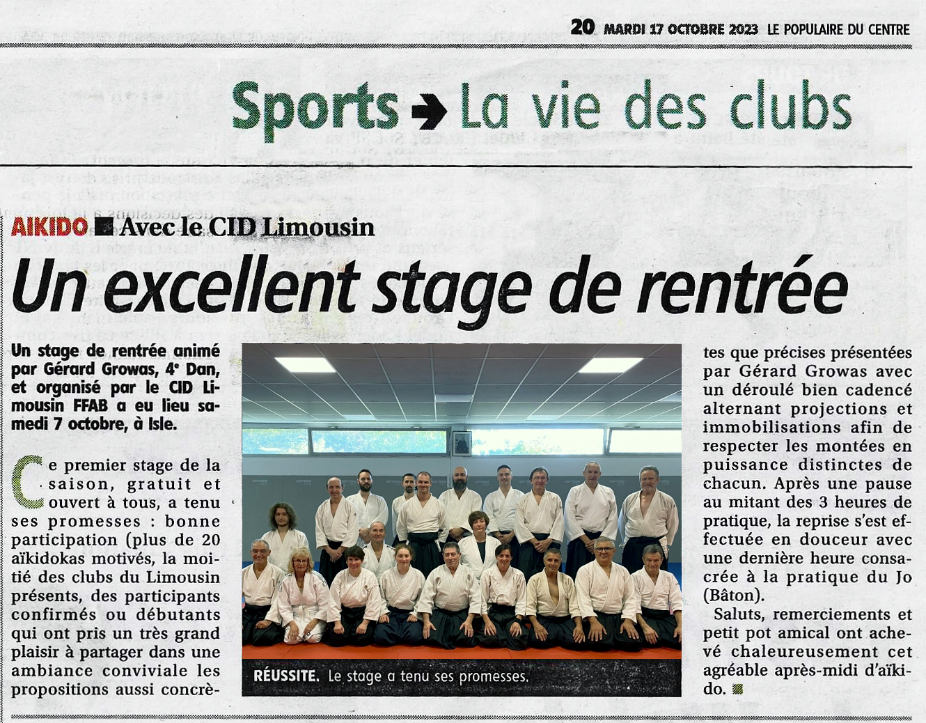 | 231007 : Stage de rentrée du CIDL, pour tous, animé par Gérard GROWAS, 4ème Dan, à ISLE. |