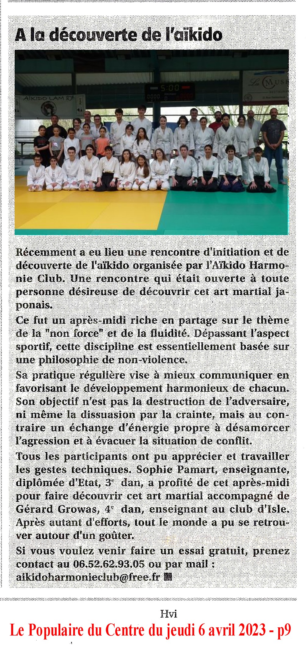 Excellent regroupement pour ce stage priv en ce samedi 6 mai 2023.é proposé et animé par Sophie PAMART, 3ème Dan, au sein de son Club Harmonie sur le grand Dojo de Cheops Si, si, très dynamique stage de découverte puisque pas moins de 25 Aïkidokas de tous âges prirent goût à venir pratiquer en ce samedi déjà bien chaud... Nous étions quatre du Club à venir soutenir cette initiative, Evguenia, Jacques, Pascal et ma p'tite Pom'. Photos du Club Harmonie par Jacques Buisson, mise en images gg. |
