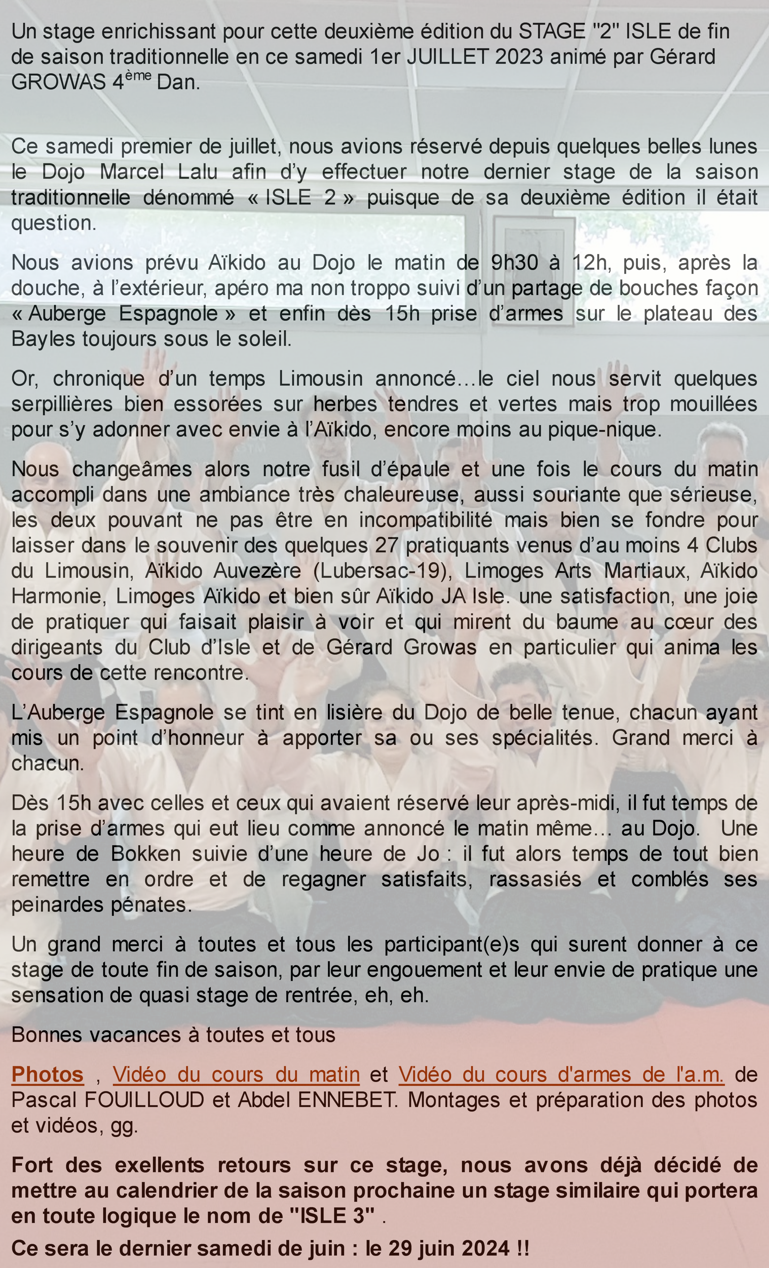230701 : STAGE "2" ISLE de fin de saison, privé et ouvert à tous à Isle. Animation, Gérard GROWAS, 4ème Dan. |