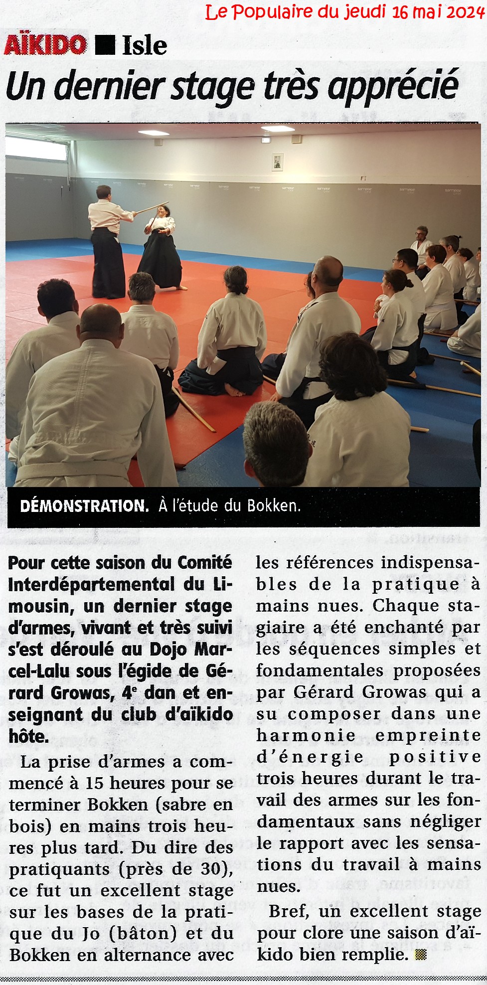 Pour cette saison 2023/2024 du CID Limousin, un dernier stage vivant et très suivi s'est déroulé au Dojo Marcel Lalu sous l'égide de Gérard GROWAS 4D. Ce fut donc à Isle, samedi a.m. 4 mai au beau milieu "des Lutins bleus" de l'ovalie que la prise d'armes put commencer à 15h pour se terminer Bokken en mains vers 18h. Du dire des pratiquantes et pratiquants (près de 30) un excellent stage sur les bases de la pratique du Jo et du Bokken en alternance avec les références indispensables de la pratique à mains nues. Nous y étions 11 du Club d'Isle toutes et tous enchanté(e)s par les séquences simples et fondamentales proposées par gg. Photos et vidéo de Pascal Fouilloud, préparées par gg. A l'issue du stage la Commission Technique du CIDL s'est réunie : le calendrier prévisionnel de la saison prochaine a été quasi arrêté, le prochain ACT (Animateur de la Commission Technique) a été désigné à l'unanimité des présents en la personne de Florent Hibon (Haute Corrèze Aïkido) et enfin la décision a été prise de revoir sereinement la composition et le rôle des membres de la Commission Technique en adéquation avec les réalités des Clubs du CIDL. Point à suivre. |