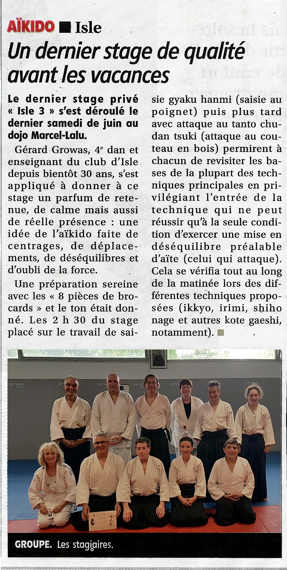 Une belle réussite dans la discrétion pour notre stage privé "Isle 3", dernier de la saison, en ce samedi 29 juin 2024 aux couleurs de l'été. Gérard GROWAS, 4ème dan et enseignant du Club d'Isle depuis bientôt 30 ans, s'évertua à donner à ce stage en lisière d'été un parfum de retenue, de calme mais aussi de réelle présence : une idée de l'Aïkido faite de centrages, de déplacements, de déséquilibres et d'oubli de la force. Une préparation sereine avec les "8 pièces de brocards" et le ton était donné. Les 2h30 du stage placé sur le travail de saisie Gyaku Hanmi puis plus tard avec attaque au Tanto Chudan Tsuki permirent à chacun de revisiter les bases de la plupart des techniques principales d'Aïkido en privilégiant l'entrée de la technique qui ne peut réussir qu'à la seule condition d'exercer une mise en déséquilibre préalable d'Aïte. Ce qui se vérifia tout au long de la matinée lors des Ikkyo, Irimi, Shiho Nage, et autres Kote Gaeshi, notamment. Un grand merci à celles et ceux qui ont partagé cette matinée de bien agréable pratique : Tiphaine du LAM, Thierry et Bernard de Limoges Aïkido sans oublier Aurélie, Christiane, Evguenia, Abdel, Christophe, Pascal et Richard du Club d'Isle. A l'issue du cours du matin, Gérard prit plaisir à décerner un 6ème Kyu à Christine CHARON qui, victime d'un accident ne pouvait être présente ce samedi, puis un 4ème Kyu à Aurélie LEMONNIER avec félicitations and applause in the Dojo A l'issue de cette séance Pascal FOUILLOUD convia tous ce petit monde à un pot aussi amical que bien préparé par ses soins dans la salle jouxtant le Dojo. A la suite de quoi ce fut le temps des partages de bouche façon auberge espagnole comme chaque année... Ce toujours plaisant temps de partages s'inscrivit un rien dans la durée... Ce qui, ajouté à la température extérieure plutôt sérieuse, fit qu'à à l'unanimité des présentes et présents la traditionnelle prise d'armes de l'a.m. fut abandonnée Photos du stage, vidéo de la remise de SanDan à Abdel et photos de l'after Dojo disponibles, suffit d'cliquer dessus ! Tous documents de Pascal mis en images par gg. Et l'Article de Presse du Populaire en date du mardi 16 juillet 2024 ! |