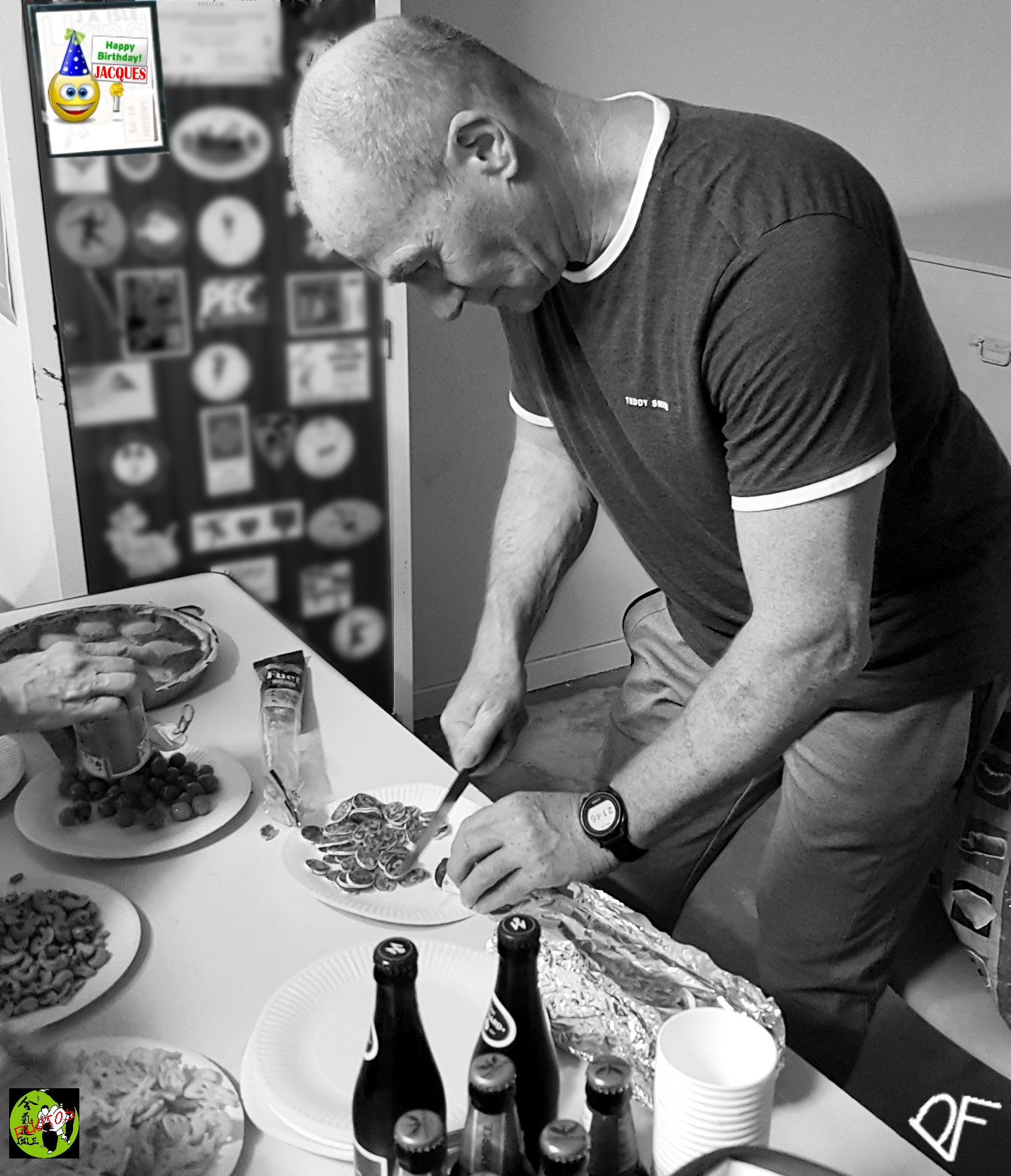 Chronique d'une visite annoncée de Charlotte samedi 18 et d'une fête d'anniversaire de Jacques mardi 21. Deux grands plaisir en ce samedi que de partager un cours avec elle et mardi de festoyer un brin avec lui ! La vie, quoi. Oui, chacun et chacune des présent(e)s en ce samedi matin du 18 mai bien arrosé par le ciel de serpillière prit grand plaisir à retrouver Charlotte tout au long de cette matinée d'Aïkido... Et l'invitons à revenir au Dojo tant et tant qu'elle en aura l'envie et qu'elle le pourra, que son travail de Kiné et ses déplacements le lui permettront... Et nous étions aussi heureux en ce mardi soir 21 mai pour, après le cour ponctué d'impromptues stridences d'alarme incendie sans gravité, fêter un très bel anniversaire à Jacques qui nous avait mitonné en sus quelques subtiles douceurs de bouches... Et pour garder trace du samedi , 1 photo couleur et une photo N&B (Pascal et Ritch, montage gg). Pour le mardi et l'after hour, photo 1, photo 2, photo 3 de Pascal, prépa et montage gg. |