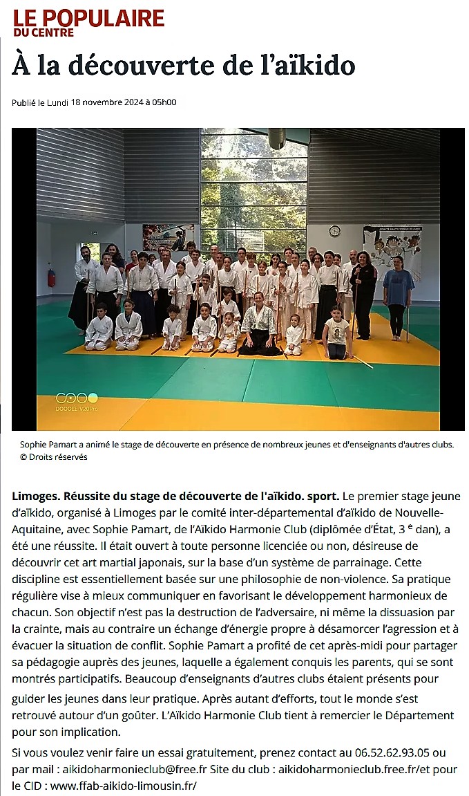 Ce deuxième stage du CID Limousin à Cheops ouvert aux "Jeunes-mais-pas-que" a tenu toutes ses promesses, rondement animéqu'il fut par Sophie PAMART, 3D : En ce samedi 2 novembre, lendemain de Toussaint et encore en pleines vacances scolaires le grand Dojo de Cheops à Limoges recevait 40 Aïkidoka de tous âges (une vingtaine de "Jeunes" et une vingtaine d'adultes), panel parfaitement équilibré, pour une séance dynamique d'Aïkido bien cadencé, de 14h30 à 17h. Nous y étions 7 du Club d'Isle ou presque : Aurélie, Evguenya, Jacques, Laurent, Stéphane, sans oublier Emma, notre "jeune" du jour et moi-même, dans l'autre catégorie Après une belle mise en jambes avec le Jo, suivi d'un temps de jeu par ateliers ludiques, Sophie a souhaité convier chacun à une séance d'Aïkido basée sur les déplacements et la forme "Ura" des choses, soit en groupe où les enfants et jeunes pratiquaient avec les adultes, soit sous une autre option en alternance sur deux groupes, d'un côté les pratiquants avec Hakama, de l'autre et sous sa direction les Jeunes et les adultes débutants. Elle reprenait possession de l'ensemble pour terminer le cours sur une séance déterminée d'étirements-relâchements... A l'issue du stage, le CIDL et le Club Harmonie invitèrent tout ce petit monde de l'Aïkido Limousin à partager un goûter fort apprécié par tous. Merci à Sophie et Jacques pour la photo de groupe et celle du salut, traces photos préparées par gg |