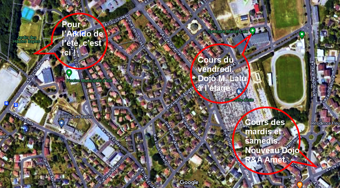 Cours des Mardis (20h-22h) et Samedis (10h-12h) : Nouveau Dojo René et Alain Amet. Adresse : 2 avenue de la République 87170 Isle (ancienne Maison du Temps Libre) |
